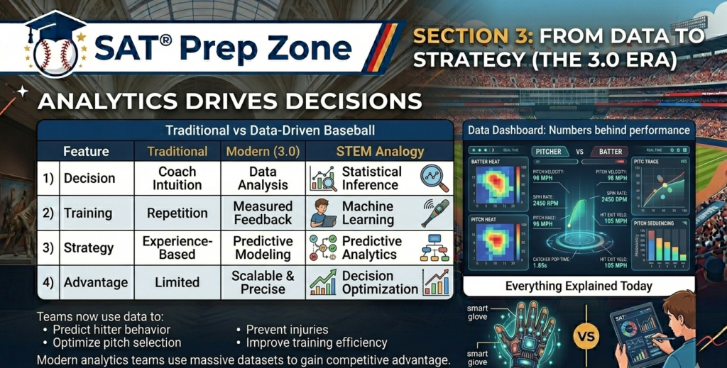 This data allows teams to analyze performance scientifically instead of relying only on experience. It transforms baseball into a data-driven decision system, similar to solving SAT problems using evidence.